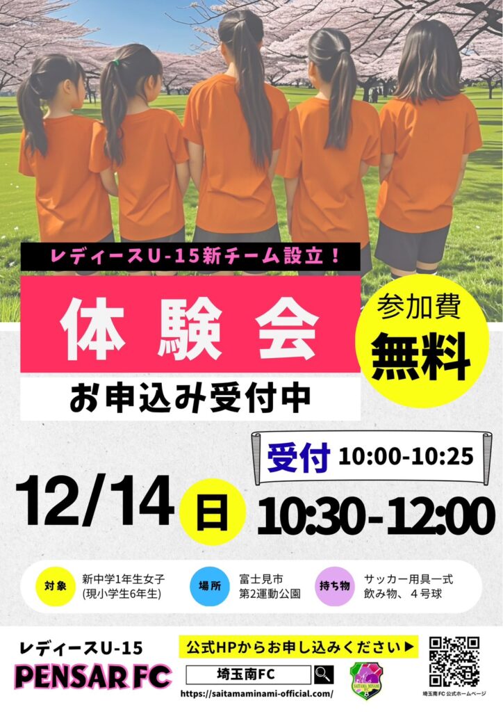 新チーム設立 PENSAR FCレディースU15体験会この度、PENSAR FC(ペンサール) レディース U15では現6年生女子を対象に体験会を行います…